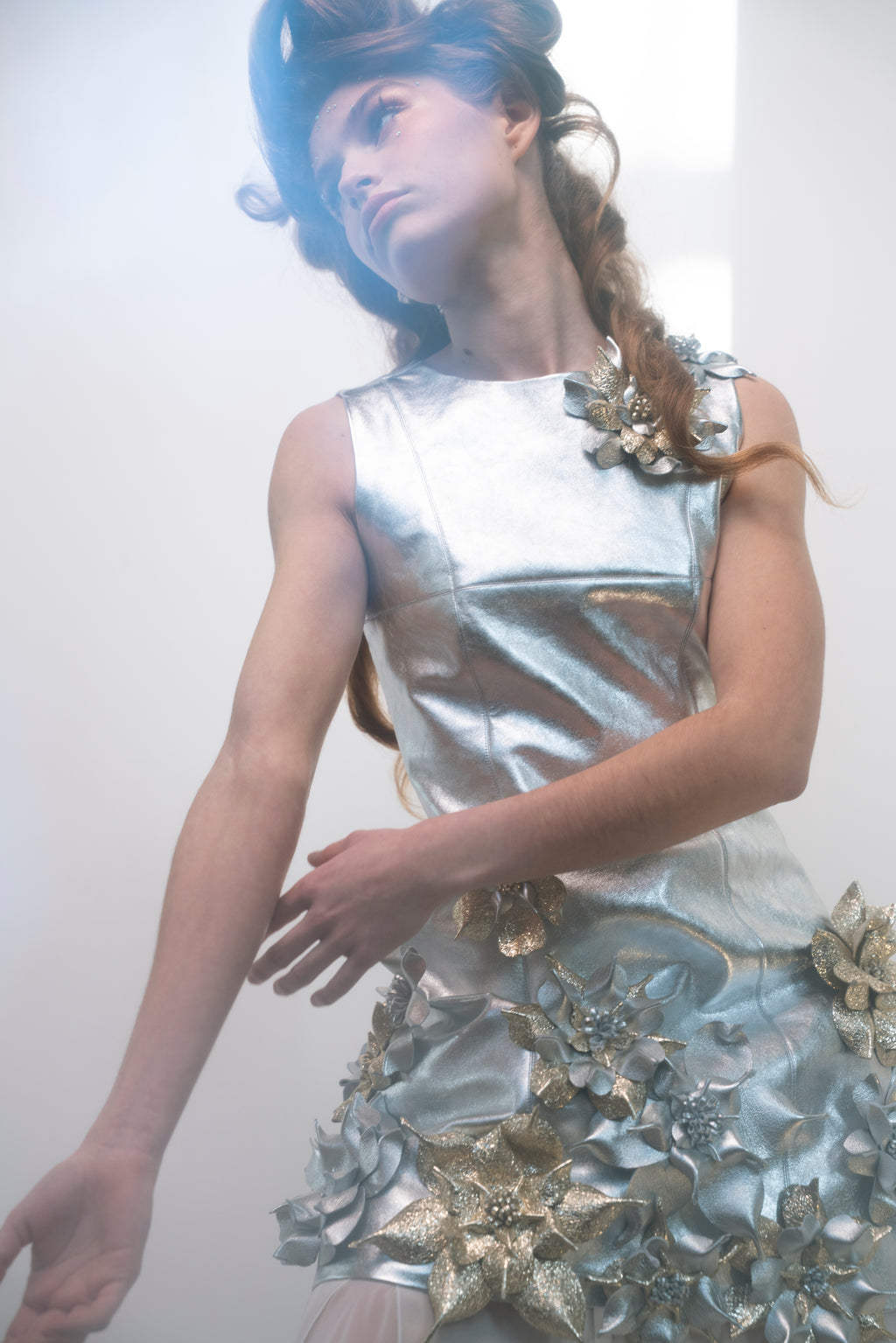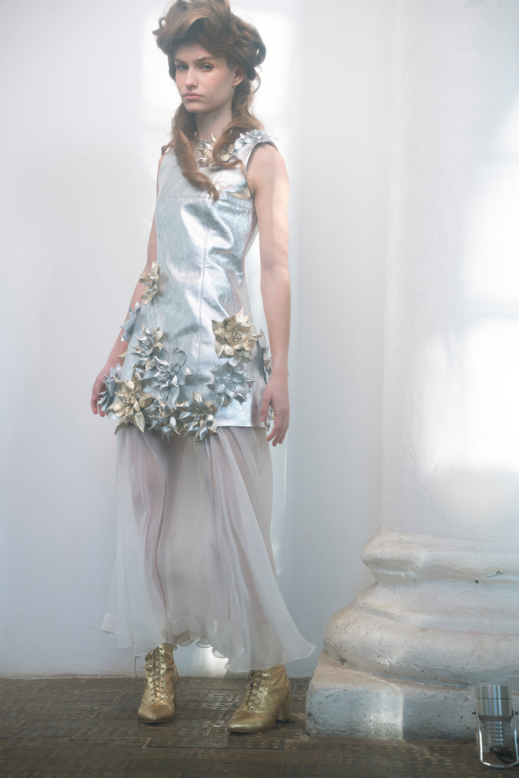 This dreamy  yet contemporary dress is made from genuine metallic leather, lined with soft silk, adorned with hand crafted leather flowers and comes in a set with a silk chiffon layer skirt. It is a perfect match for a small party when worn alone as a mini dress and can be altered for a more special occasion with the addition of the silk chiffon layer skirt that adds an even dreamier and more festive feeling.