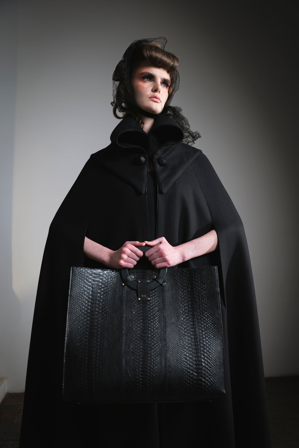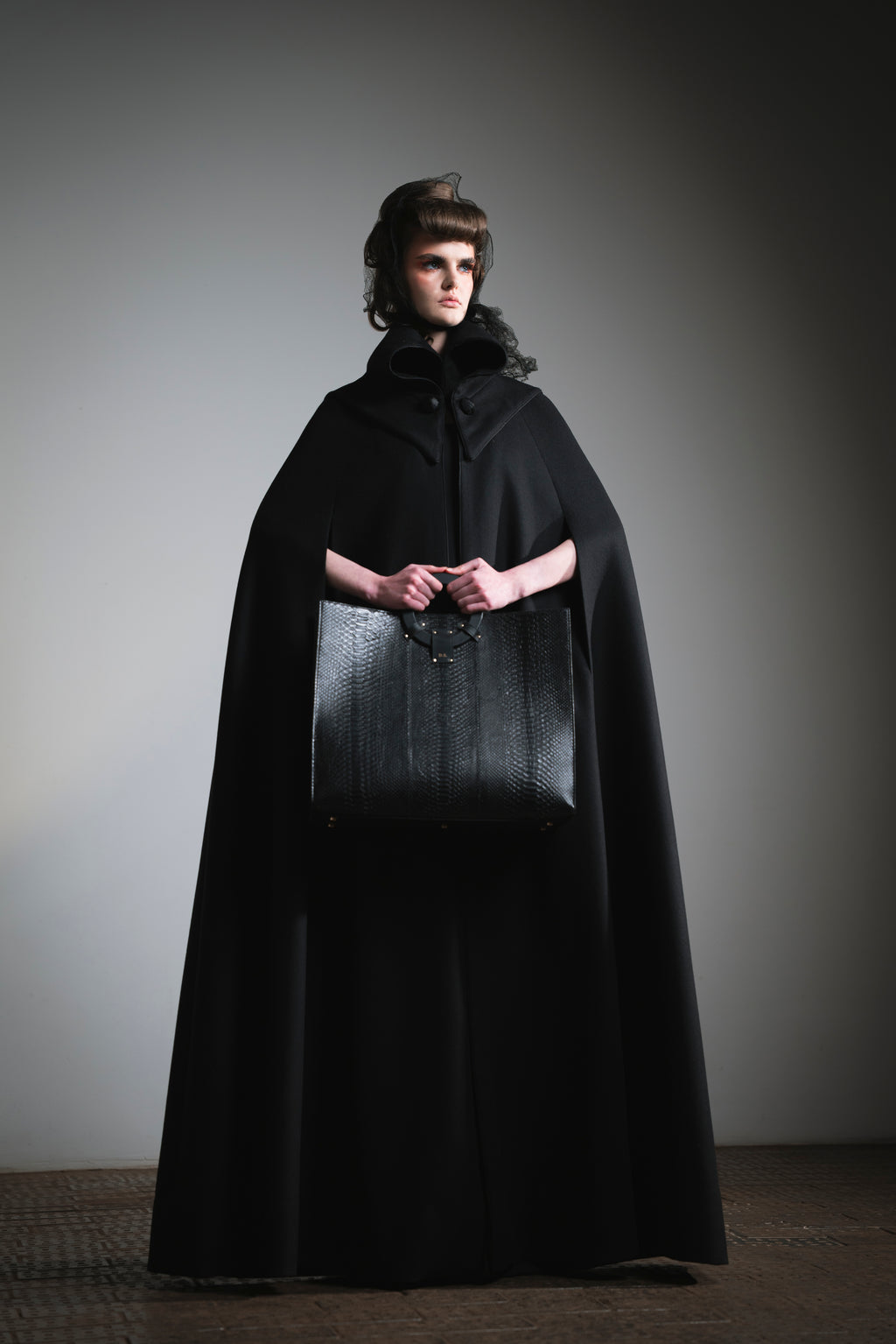Made of 100% cashmere and lined with silk, this regal statement piece will add power and  character to any wardrobe. It will look just as splendid on a walk through foggy woods or a busy city afternoon, as well as a night to the opera. HAs a very strong silhouette and a heart shaped regal collar.