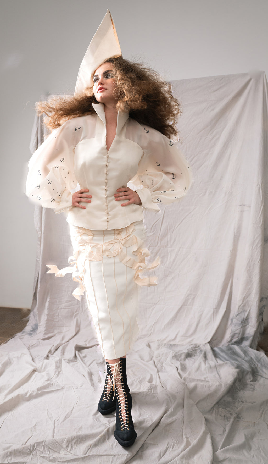 An extravagantly hugging pencil skirt with a corset back, accentuating the feminine silhouette. The skirt has a row of functioning hooks on each side seem, allowing you to close them fully or leave them open as extra slits on the sides. The 3 D cotton ribbon bows, reaching out of the borders of the skirt give an unusual twist and playfulness to the skirt.